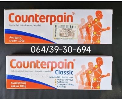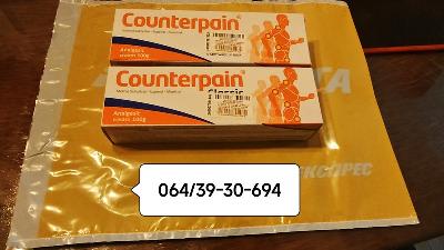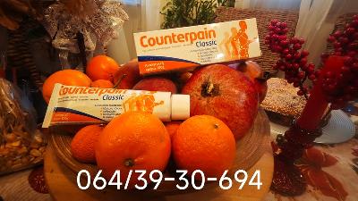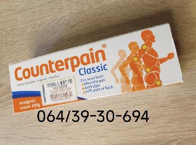 Deluje posle prvog mazanja , Counterpain Classic PharmaSwiss, ima široku primenu kod profesionalnih sportista rešava mnogo brze problem sportskih povreda . Counterpain Classic 100gr je krema koja ublažava bolove u mišićima zglobovima i reumatske tegobe kao i povrede nastale pri sportskim aktivnostima . Grčka krema perfektna za kičmene i reumatske probleme. Counterpain Classic kremu koriste profesionalni sportisti . . . a pre svega fudbaleri. Deluje odlično za bolove u mišićima, bolove u zglobovima, bolove u leđima, umirujući artritički bol. Counterpain – bezbolni krem proizvodi napravljeni od strane lokalnih analgetika iz grupe zajedničkog, mišića i skeletnih poremećaja. Mišićni bol, lumbago, išijasija, reumatizam, bol u leđima i struku, artritis. Aktivni sastojci su metil salicilat 10,2%, eugenol 1,36% i mentol 5,44% . . . Deluje umirujuće i efekat koji izaziva bolju cirkulaciju krvi, čime nestaje bol u leđima, struku, mišićima i zglobovima. Utrljava se dva do tri puta dnevno na bolno mesto , koža veoma brzo upije i ne ostaju tragovi na odeći. Original iz PharmaSwiss, nije kineska kopija kreme.